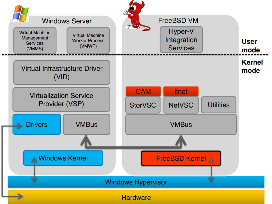 Veja na imagem abaixo, a ilustração de como o FreeBSD acessa os recursos do Hyper-V utilizando o Integration Services: