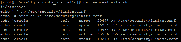 O Quarto script chamado de “4-pre-limits.sh” insere os parâmetros no arquivo “/etc/security/limits.conf” para que o oracle utilize as limitações minimas para seu normal funcionamento no sistema operacional.