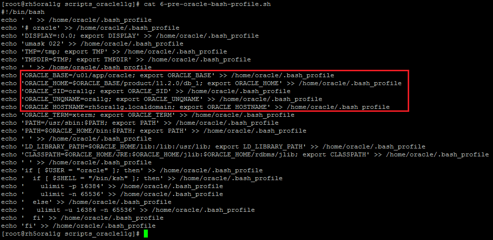 O Sexto script chamado de “6-pre-oracle-bash-profile.sh” insere no .bash_profile do usuário oracle os parâmetros necessários para criar uma instancia de banco de dados no Oracle Database. Na imagem abaixo , a parte grifada de vermelho varia conforme seu ambiente. Nisso aonde as variáveis informadas abaixo, como ORACLE_BASE (diretório base de instalação do Oracle), ORACLE_HOME(diretório aonde o Database será instalado), ORACLE_SID(nome da instancia do Oracle) , ORACLE_UNQNAME (nome da instancia do Oracle) e ORACLE_HOSTNAME(nome do servidor aonde o Oracle está sendo instalado).