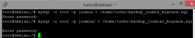 1 2 | root # mysql -u root -p joomla < /home/turbo/backup_joomla_migracao.sql root # mysql -u root -p joomla2 < /home/turbo/backup_joomla2_migracao.sql |
