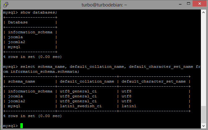 1 2 3 | mysql> show databases; mysql> CREATE DATABASE `joomla` DEFAULT CHARACTER SET utf8; mysql> CREATE DATABASE `joomla2` DEFAULT CHARACTER SET utf8; |