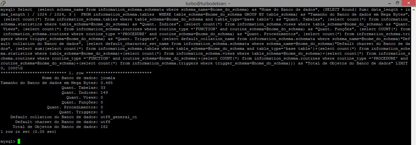 1 2 3 4 5 6 7 8 9 10 11 12 13 14 15 16 17 | SET @nome_do_schema = 'joomla'; Select (select schema_name from information_schema.schemata where schema_name=@nome_do_schema) as "Nome do Banco de dados", (SELECT Round( Sum( data_length + index_length ) / 1024 / 1024, 3 ) FROM information_schema.tables WHERE table_schema=@nome_do_schema GROUP BY table_schema) as "Tamanho do Banco de dados em Mega Bytes", (select count(*) from information_schema.tables where table_schema=@nome_do_schema and table_type='base table') as "Quant. Tabelas", (select count(*) from information_schema.statistics where table_schema=@nome_do_schema) as "Quant. Índices", (select count(*) from information_schema.views where table_schema=@nome_do_schema) as "Quant. Views", (select count(*) from information_schema.routines where routine_type ='FUNCTION' and routine_schema=@nome_do_schema) as "Quant. Funções", (select COUNT(*) from information_schema.routines where routine_type ='PROCEDURE' and routine_schema=@nome_do_schema) as "Quant. Procedimentos", (select count(*) from information_schema.triggers where trigger_schema=@nome_do_schema) as "Quant. Triggers", (select default_collation_name from information_schema.schemata where schema_name=@nome_do_schema)"Default collation do Banco de dados", (select default_character_set_name from information_schema.schemata where schema_name=@nome_do_schema)"Default charset do Banco de dados", (select sum((select count(*) from information_schema.tables where table_schema=@nome_do_schema and table_type='base table')+(select count(*) from information_schema.statistics where table_schema=@nome_do_schema)+(select count(*) from information_schema.views where table_schema=@nome_do_schema)+(select count(*) from information_schema.routines where routine_type ='FUNCTION' and routine_schema=@nome_do_schema)+(select COUNT(*) from information_schema.routines where routine_type ='PROCEDURE' and routine_schema=@nome_do_schema)+(select count(*) from information_schema.triggers where trigger_schema=@nome_do_schema))) as "Total de Objetos do Banco de dados" LIMIT 0, 1000\G |