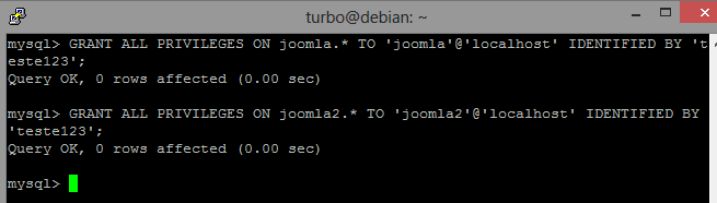 1 2 | mysql> GRANT ALL PRIVILEGES ON joomla.* TO 'joomla'@'localhost' IDENTIFIED BY 'teste123'; mysql> GRANT ALL PRIVILEGES ON joomla2.* TO 'joomla2'@'localhost' IDENTIFIED BY 'teste123'; |