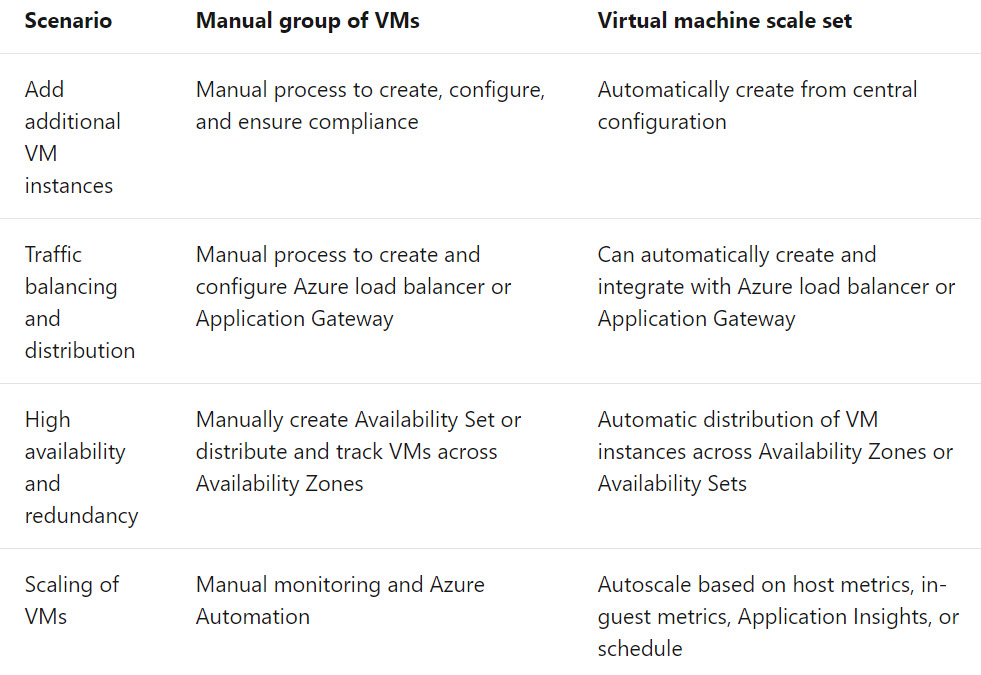 Você pode também criar e gerenciar manualmente VMs individuais ou integrar ferramentas existentes para construir um nível semelhante de automação. A tabela a seguir descreve os benefícios dos scale sets em comparação com o gerenciamento manual de várias instâncias de VM.