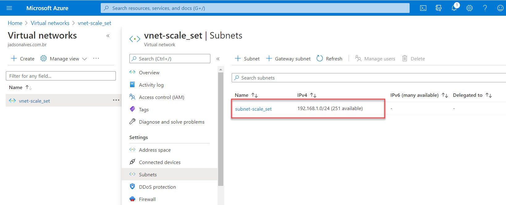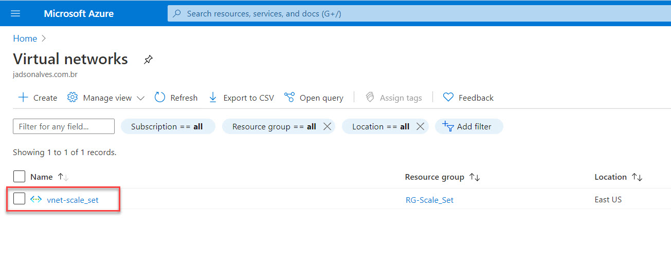 03 – No portal do Azure pesquise por virtual networks e que observe que a virtual network vnet-scale_set e subnet-scale_set foram criados com sucesso.