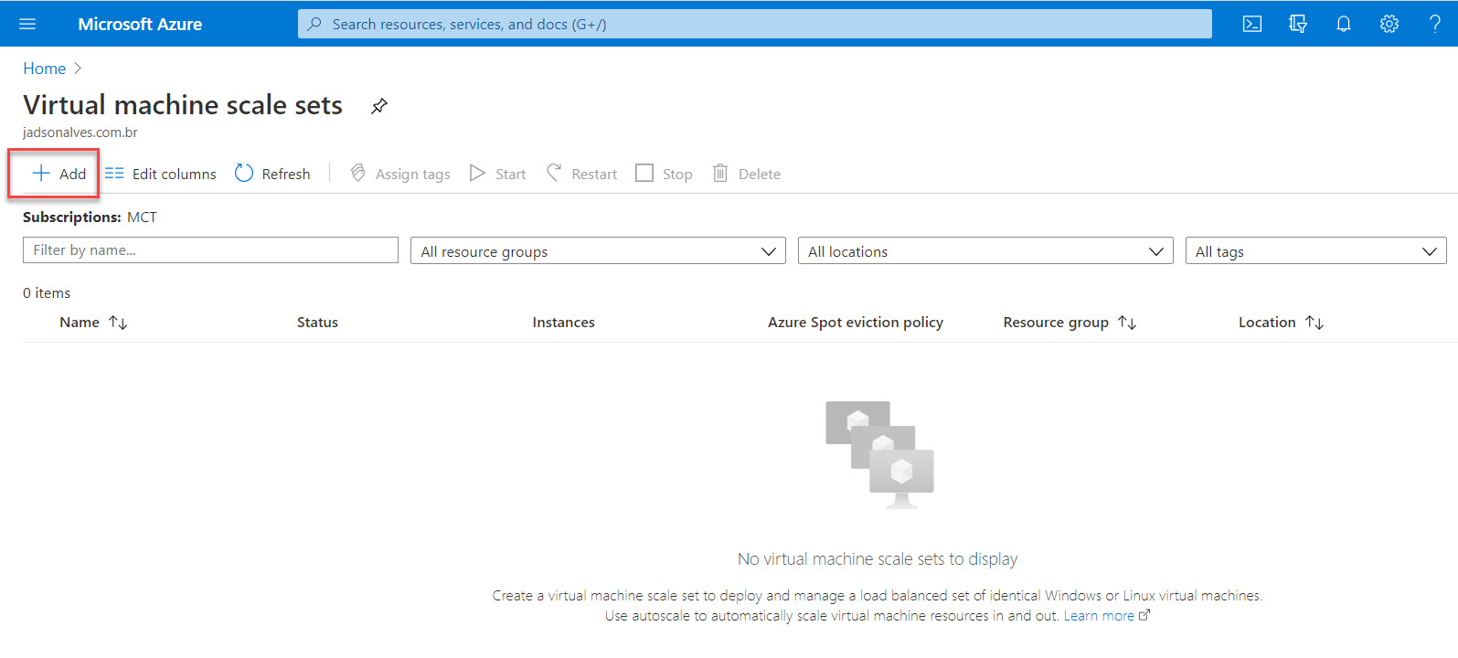 05 – Na tela Virtual Machine scale sets, clique em +Add para criar o recurso.