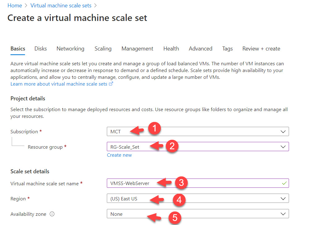06 – Na tela Basics, selecione sua subscription, em seguida selecione o resource group que deseja armazenar esse recurso. Em nosso exemplo, vamos utilizar o resource group RG-Scale_Set. O próximo passo será escolher o  nome para o virtual machine scale set.  Vamos chamá-lo de VMSS-WebServer. Vamos provisionar o recurso na região (US) East US. Não vamos configurar Avaibility zone.