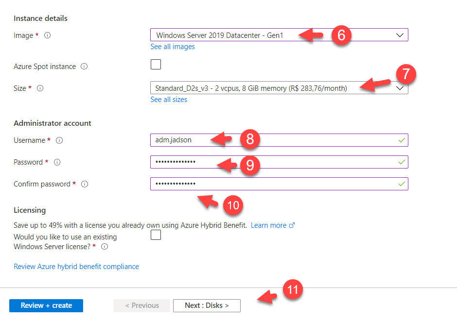 Para a opção Image, selecione a imagem do Windows Server 2019 Datacenter. Em Size iremos selecionar o tamanho da nossa máquina virtual. Aqui podemos definir opções como tamanho de memória e VCPU. Para as opções Username e Password, vamos definir o usuário e senha para fazer login na máquina virtual, em seguida clique em Next: Disks.