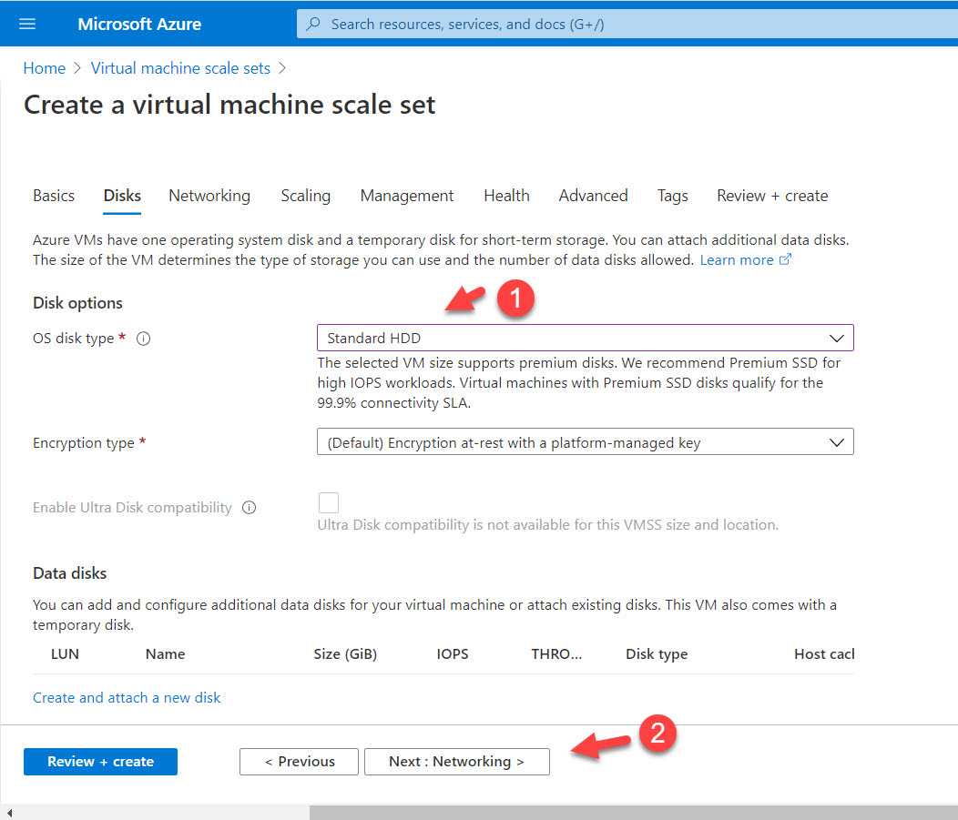07 – Na tela Disks, você irá definir qual tipo de disco será utilizado pelo sistema operacional. Podemos escolher entre os tipos Premium SSD, Standard SSD e Standard HDD. Para nosso cenário, vamos utilizar o tipo Standard HDD. Em seguida clique em Next: Networking.