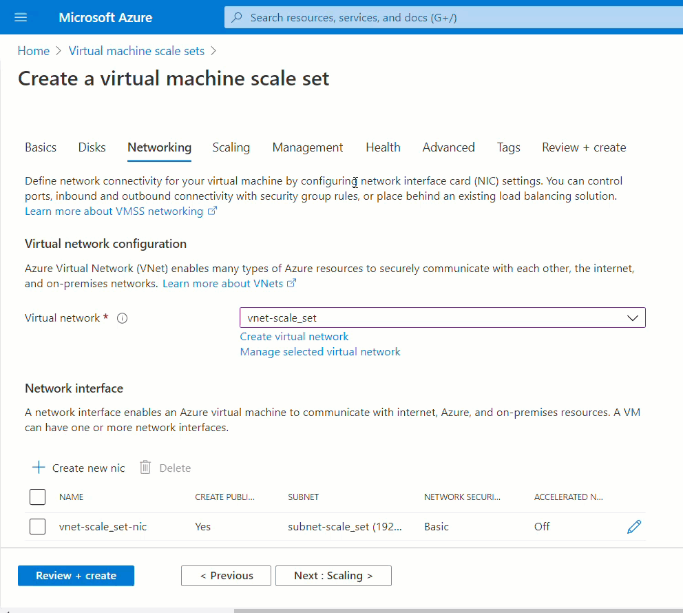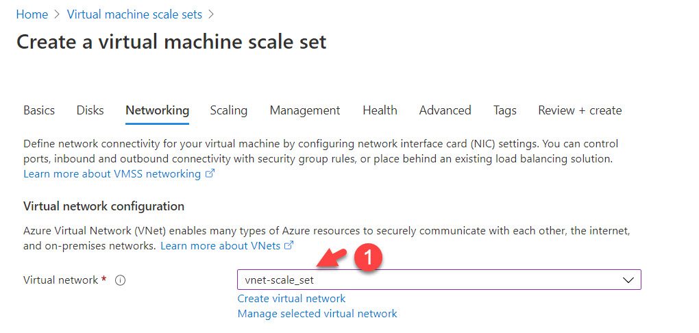 08 – Na tela Networking, vamos selecionar a virtual network que criamos anteriormente a vnet-scale_set.