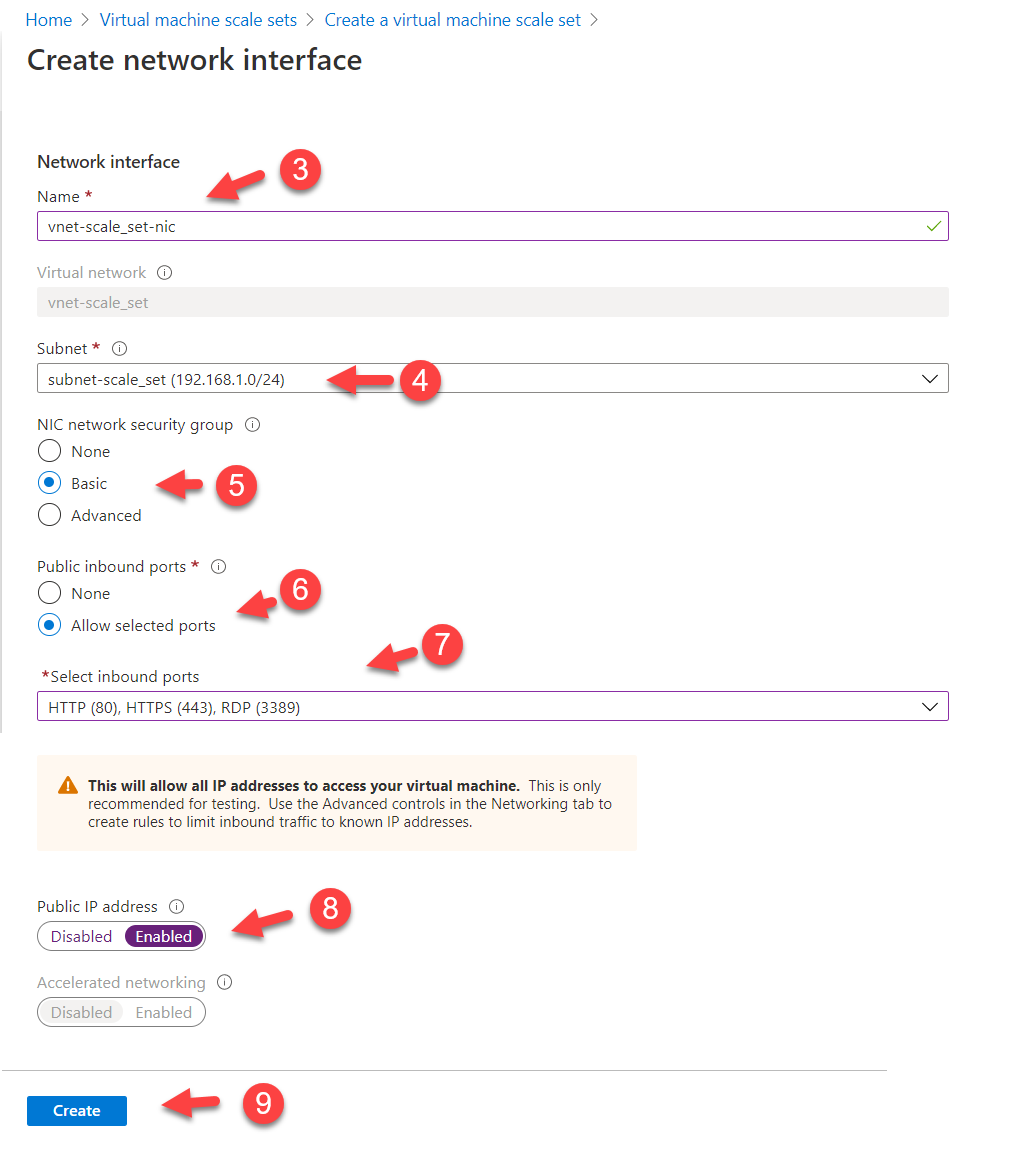 Em network interface selecione um nome para interface. Vamos utilizar o nome vnet-scale_set-nic. Em Subnet selecione a subnet-scale_set. Para a opção Nic network security group, deixe a opção Basic selecionada. Em Public inbound ports, selecione as portas 80, 443 e 3389. Para a opção Public IP address selecione Enabled. Como vamos instalar o IIS, será necessário um IP Publico para nosso site. Em seguida clique em Create.