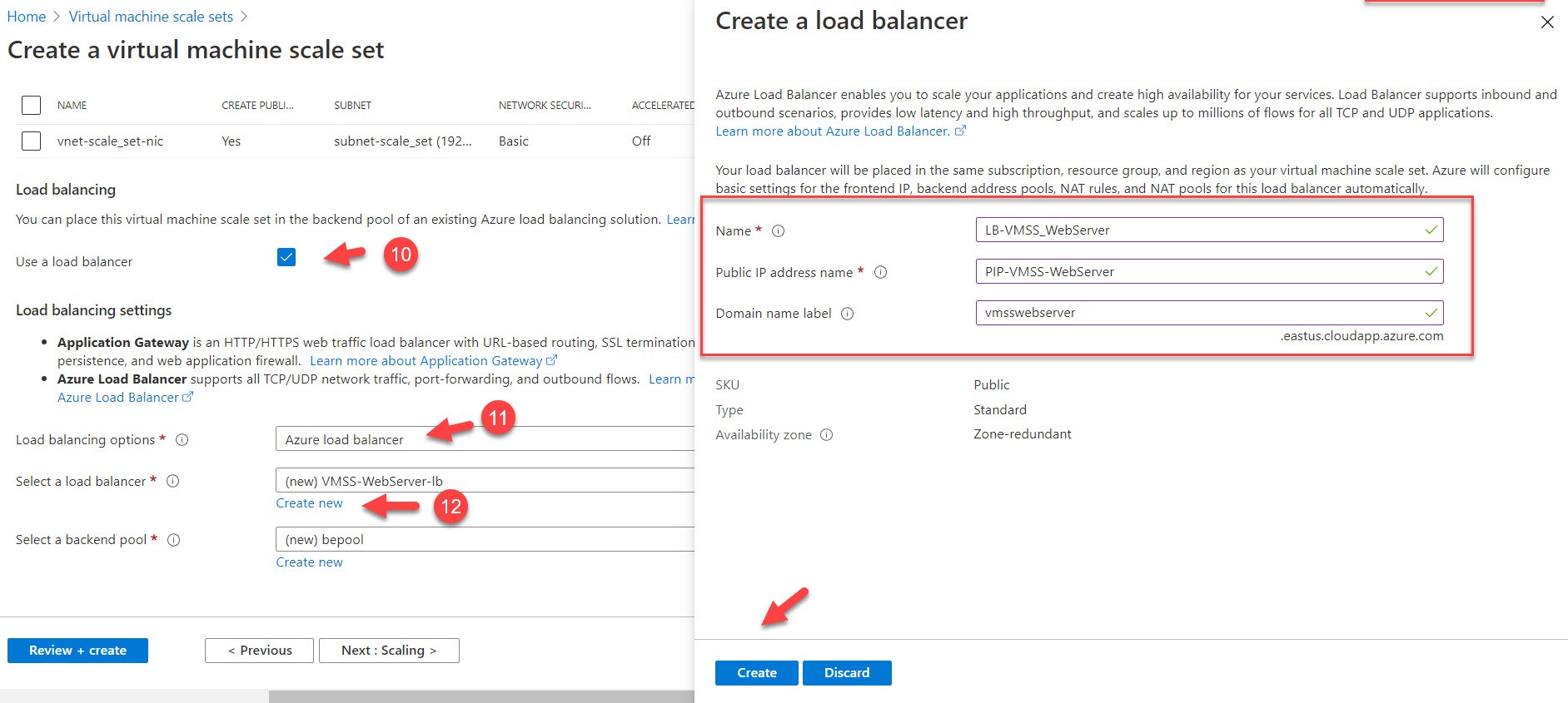 Em Load balancing, marque a opção Use a load balancer. Para a opção Load balancing options, deixe a opção Azure load balancer selecionada. Em Select a load balancer, clique em Create new. Em seguida, vamos selecionar um nome para o load balancer. Vamos chamá-lo de LB-VMSS_WebServer. Em Public IP address name, vamos selecionar o nome PIP-VMSS-WebServer. Em domain name, vamos utilizar o nome vmsswebserver. Em seguida clique em Create.