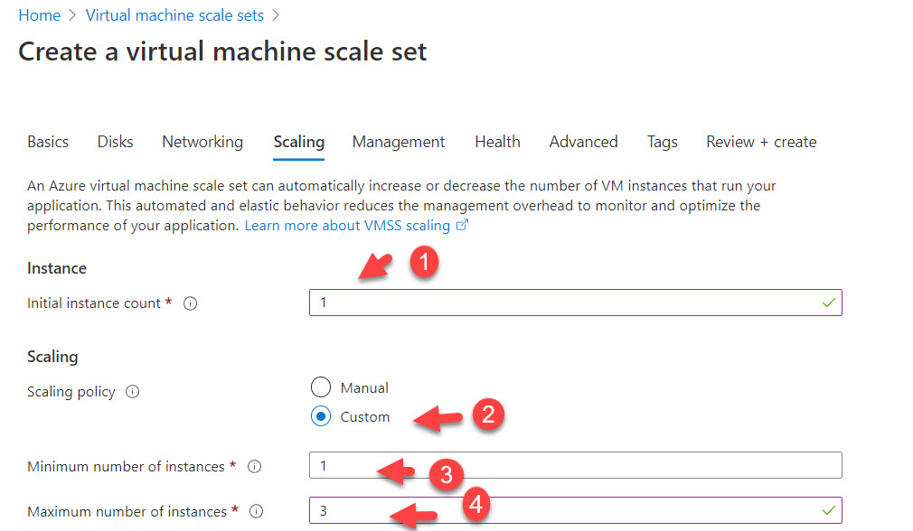 No vídeo abaixo, podemos observar como ficou configurado a guia Scaling do virtual machine scalet set.