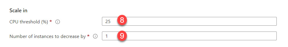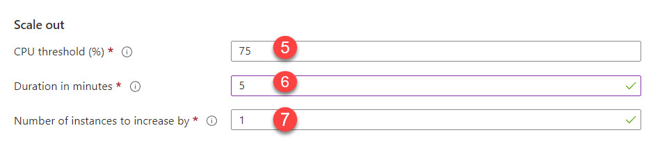 Para nosso exemplo, vamos definir os seguintes valores: CPU threshold (%) 75, Duration in minutes 5 e Number of instances to increase by 1.