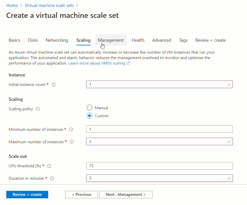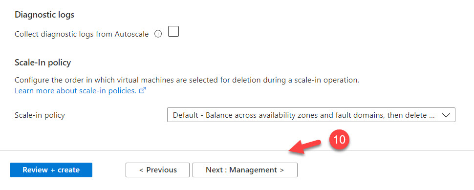 Para as opções Diagnostics logs e Scale-in policy, deixe as configurações padrão. Em seguida, clique em Next: Management.