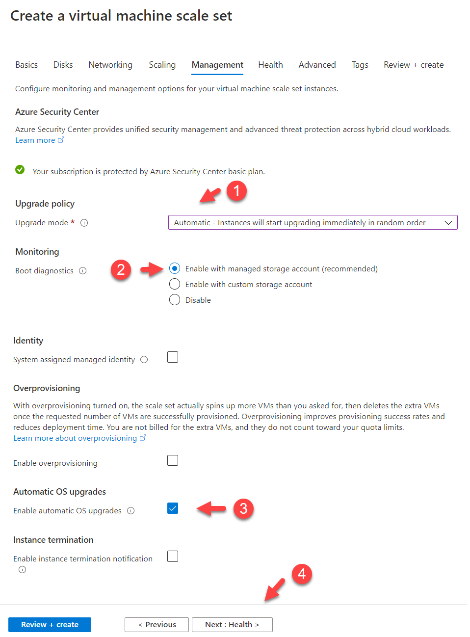 10 – Na guia Management, em Upgrade policy –> Upgrade mode, selecione Automatic – Instances will start upgrading immediately in random order. Em Monitoring — Boot diagnostics, marque Enabled with managed storage account (recomendaded). Em Automatic Os upgrades, marque a caixa de seleção Enable automatic OS upgrades. Deixe as demais configurações como padrão e clique em Next: Health.