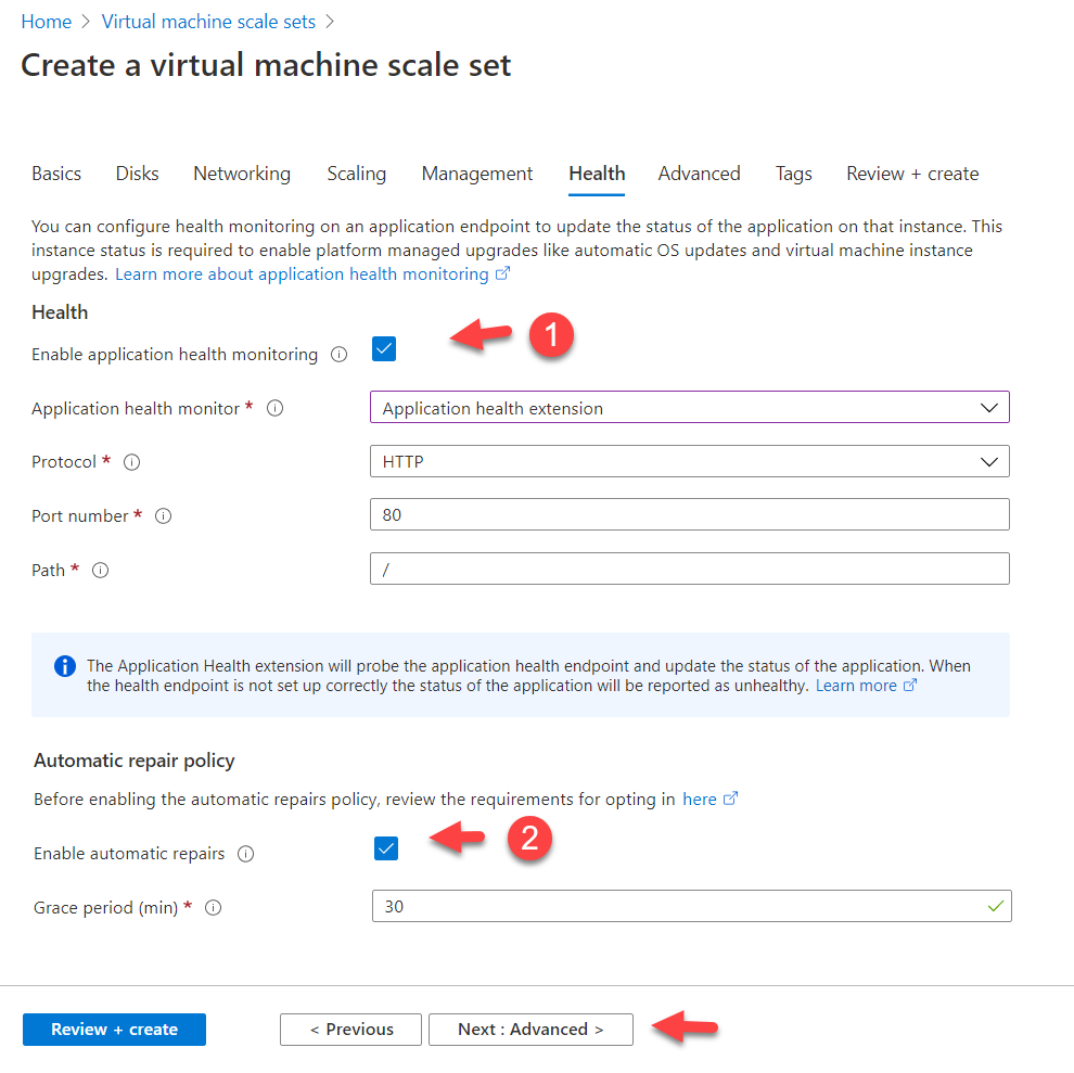 11 – Na guia Health, marque Enable application health monitoring. Vamos deixar as configurações padrão. Em Automatic repair policy, marque Enabled automatic repairs e deixe a opção padrão para Grace período (mim). Em seguida, clique em Next: Advanced.
