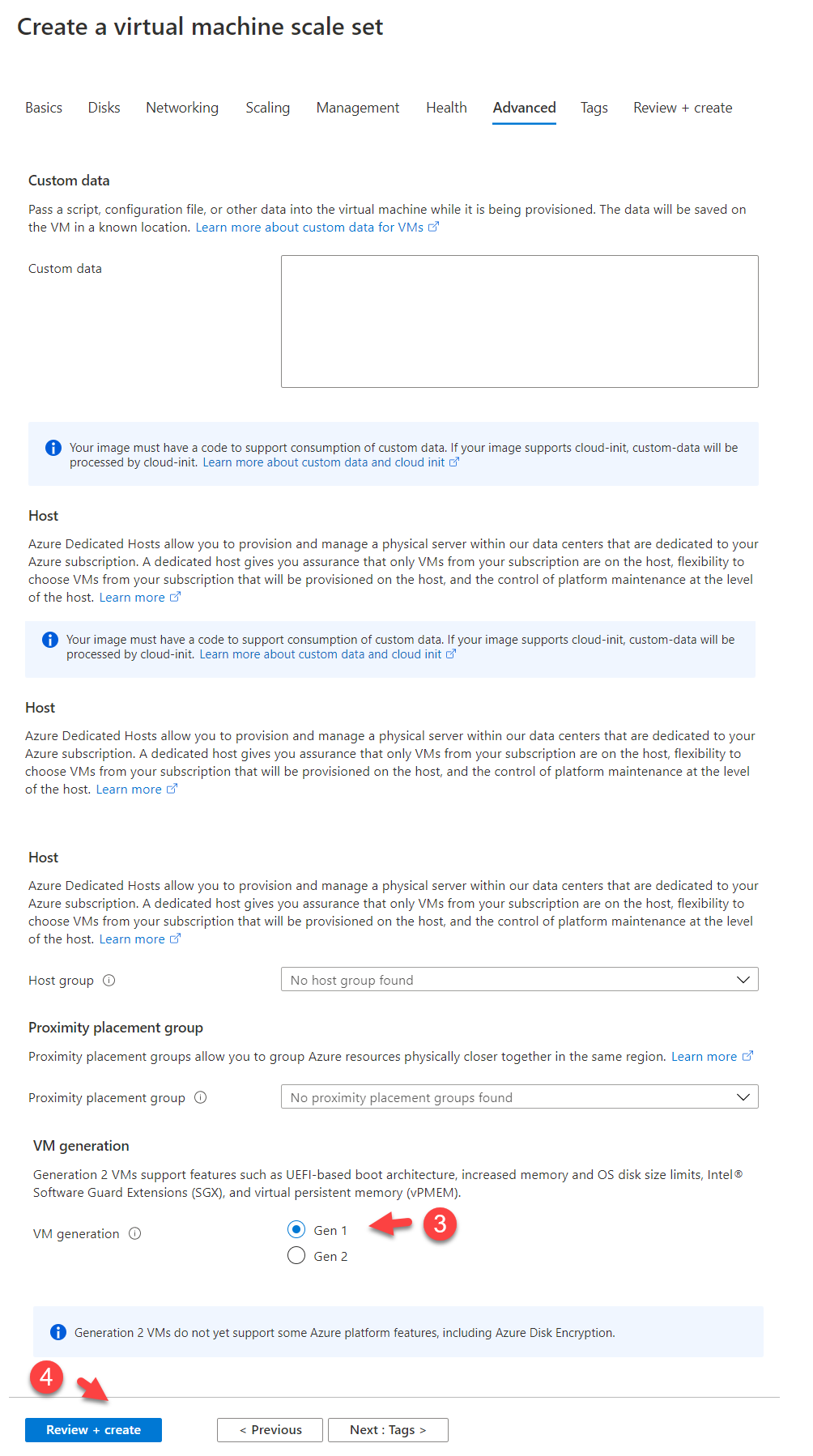 Em VM generation, vamos selecionar Gen 2. Como não vamos realizar a configuração de Tags, vamos clicar em Review + create.