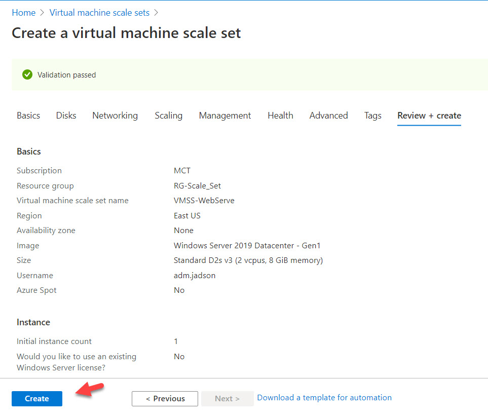 13 – Na guia Review + create, observe se todas as configurações definidas estão corretas. Em seguida, clique em Create.