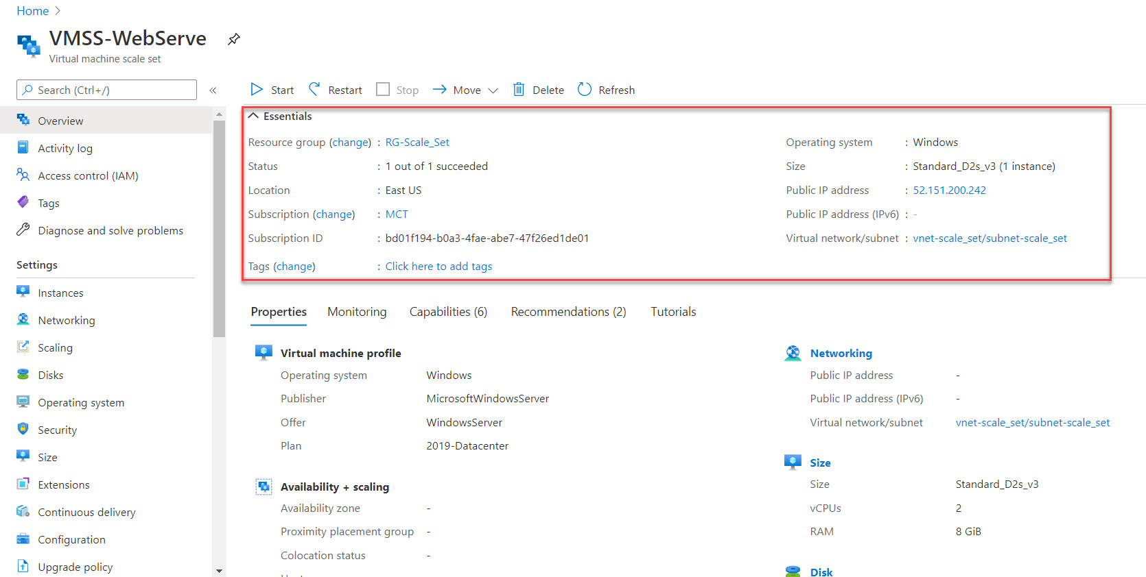 17 – Na tela VMSS-WebServe, em Overwiew, podemos verificar algumas informações sobre o recurso provisionado. Podemos observar a quantidade de instâncias que estão em execução como status. Também podemos verificar o tamanho da VM, sistema operacional, localização, IP Público e rede virtual e sub rede.