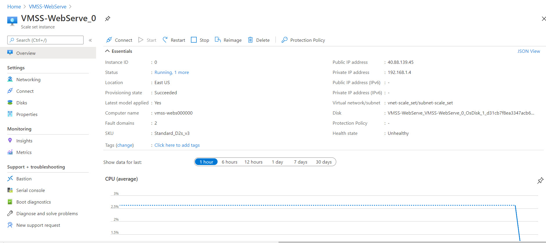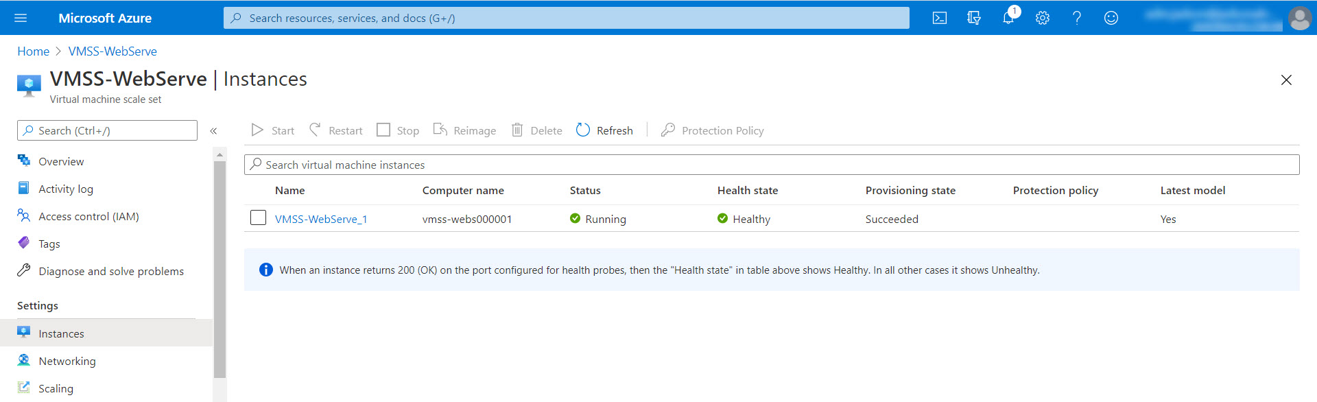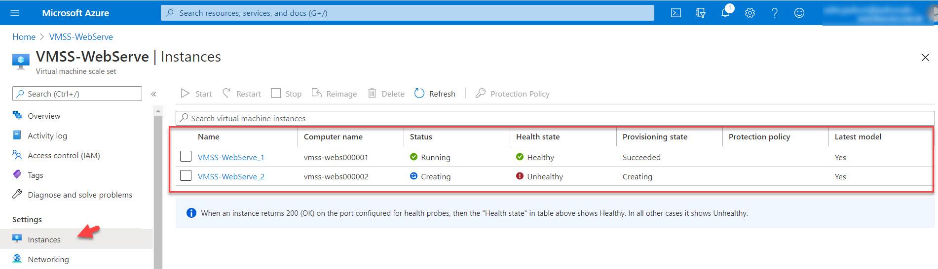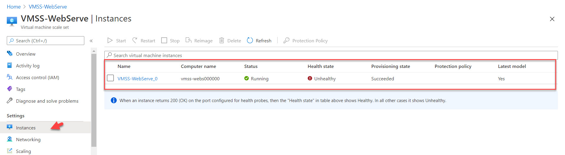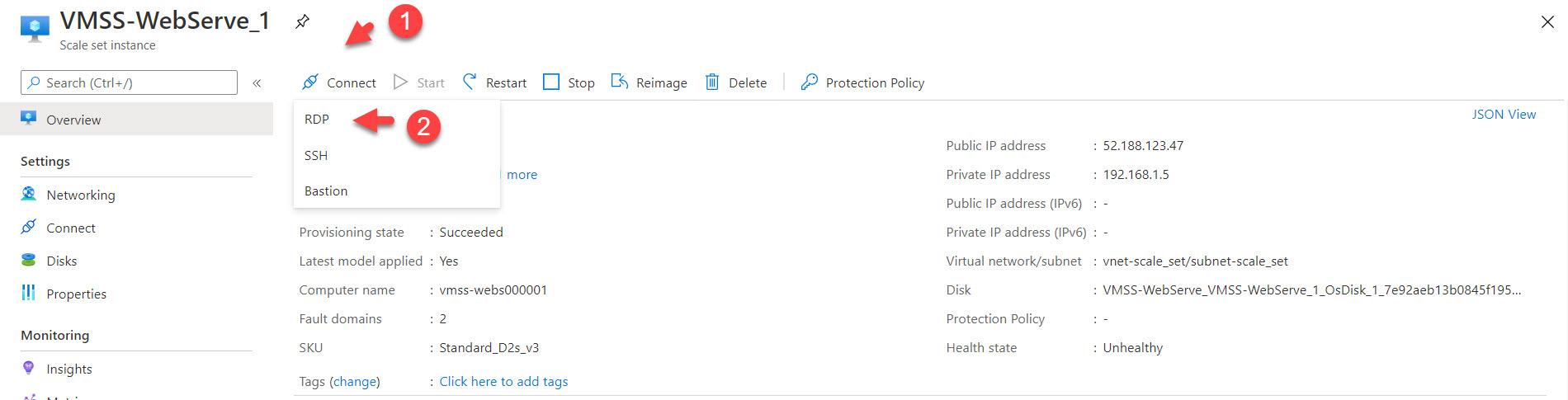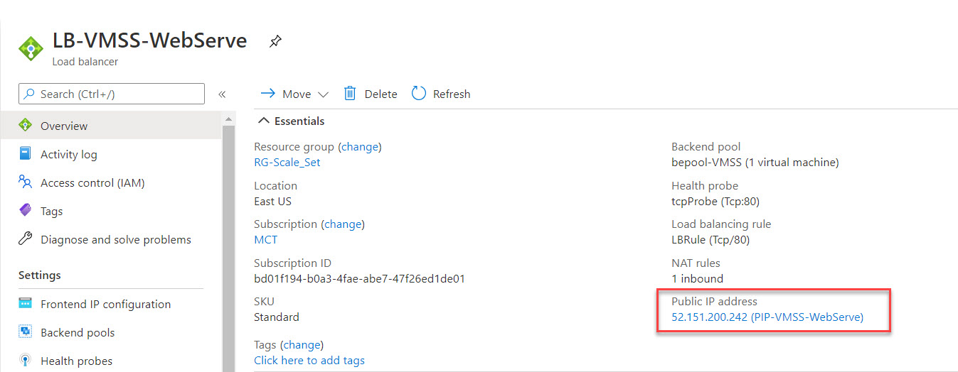 21 – Em Settings, clique em Instances e selecione a instância VMSS-WebServe_1. Em VMSS-WebServe_1 –> Overview, copie o endereço IP Público da instância.