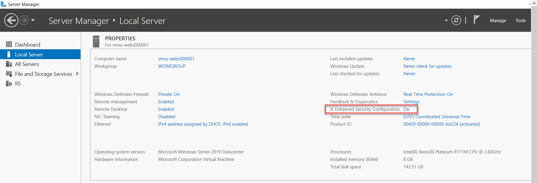25 – Agora, vamos verificar se o IIS foi instalado e se a configuração de host name para o  IIS está funcionando. Abra o Server Manager, clique em Local Server e em IE Enhanced Security Configuration.
