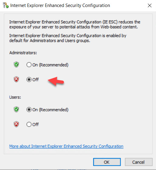 Na tela Internet Explorer Enchanced Security Configuration, em Administrators, clique em Off.