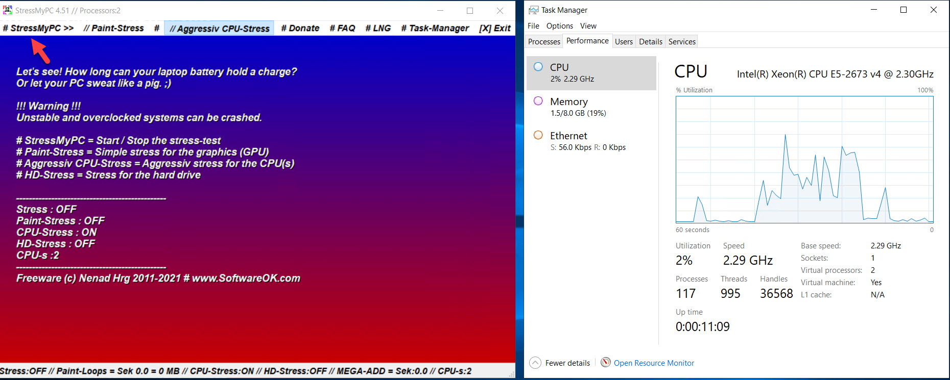 34 – Abra o Task Manager do windows –> More details –> Performance. Em seguida, execute o software StressMyPC. Vamos observar o consumo do processador atingir 100% de uso. Para iniciar o teste de Stress do processador marque a opção StressMyPC.