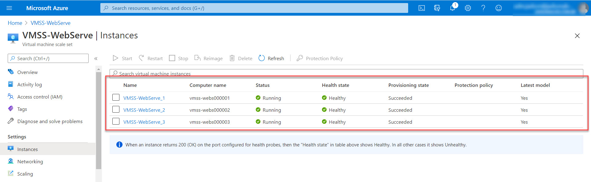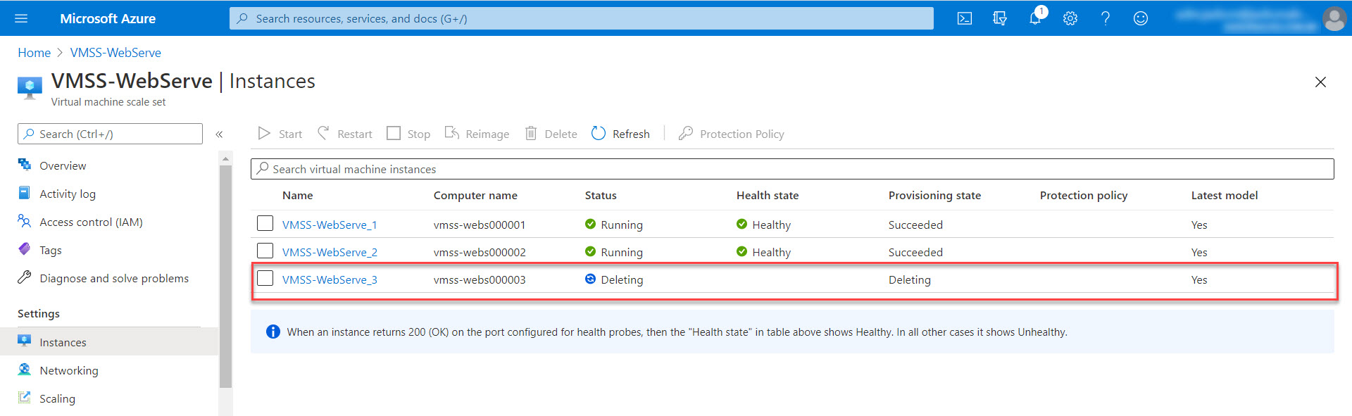 Observe que as requisições foram direcionadas para a instância vmss-webs000003.