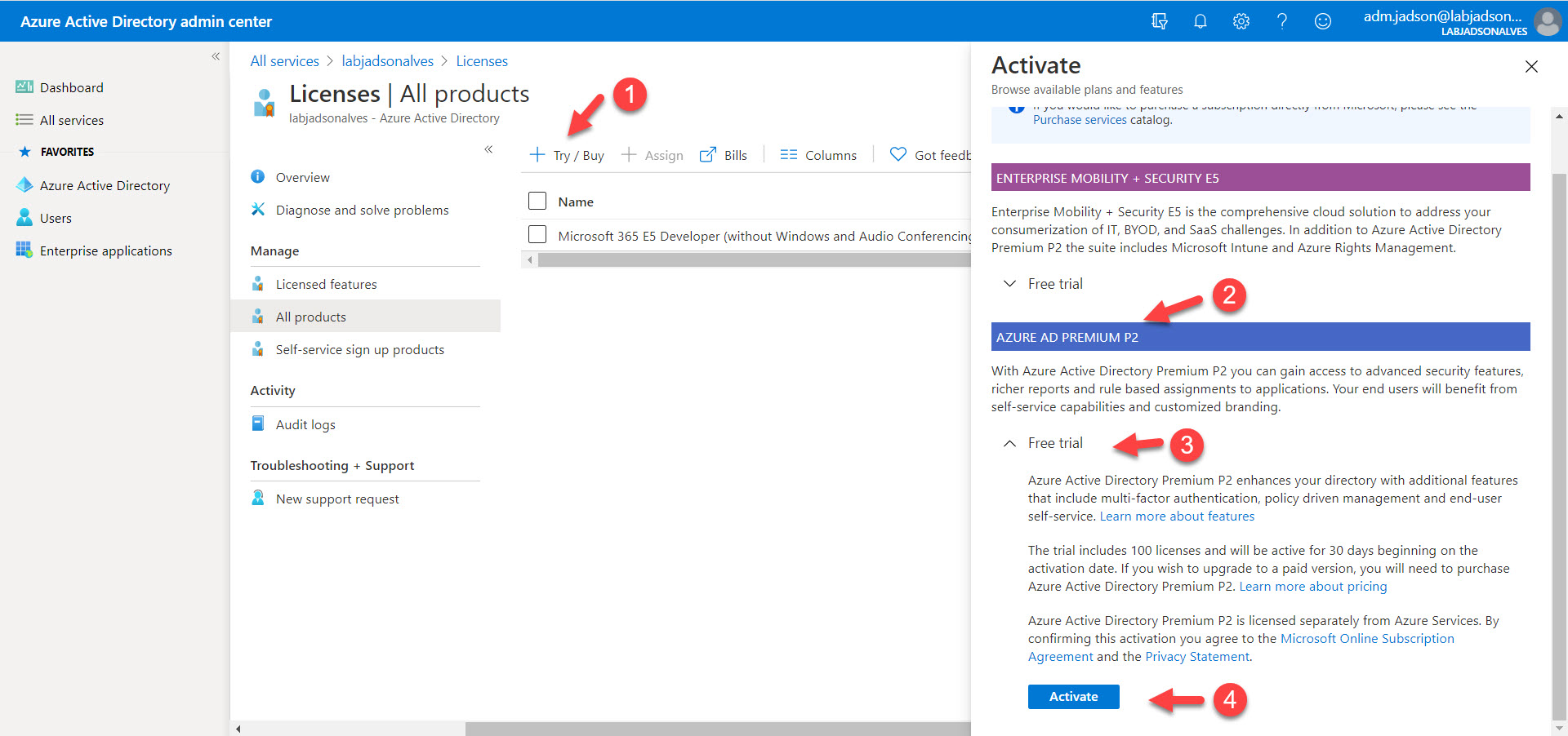 05 – A tela Activate será exibida. Em AZURE AD PREMIUM P2, clique em Free trial e Activate.