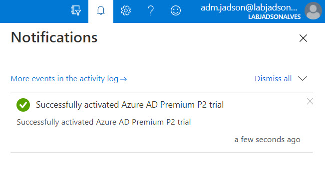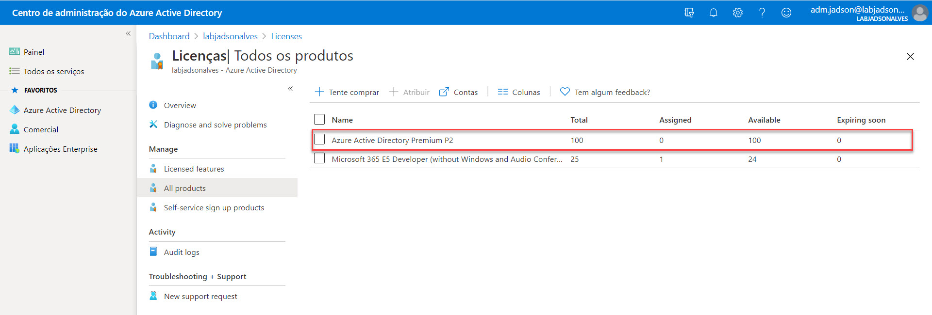 07 – Atualize a página do portal do Azure pressionando f5. Observe que a licença Azure Active Directory Premium P2 está disponível para ser utilizada logo em seguida.