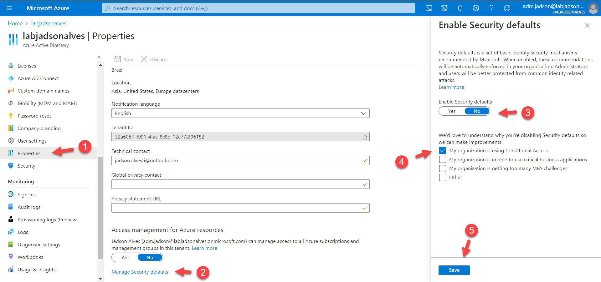 Por padrão, o Azure Active Directory habilita o MFA para todos os administradores. Isso causará problemas ao configurar a conditional Access, já que o MFA será habilitado na conditional Access. Por isso, é preciso desabilitar a configuração padrão de segurança.
