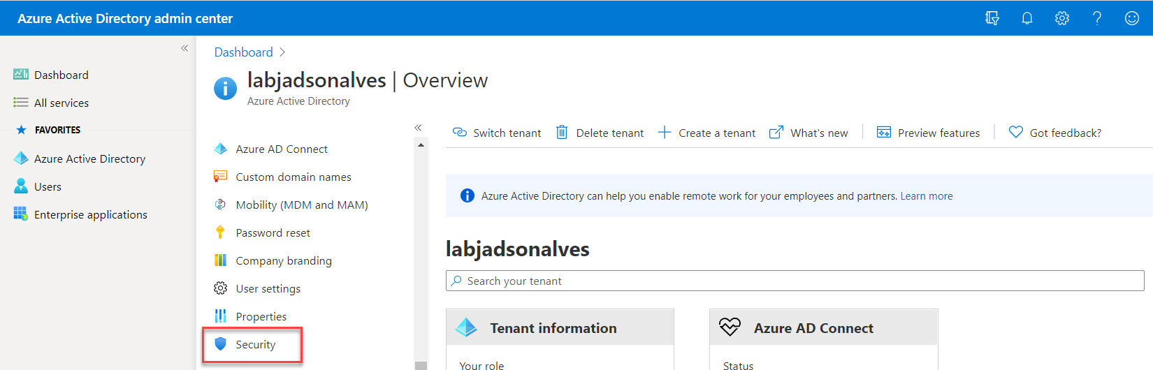 08 – Na tela overview do Azure Active Directory, em Manage, clique em Security.