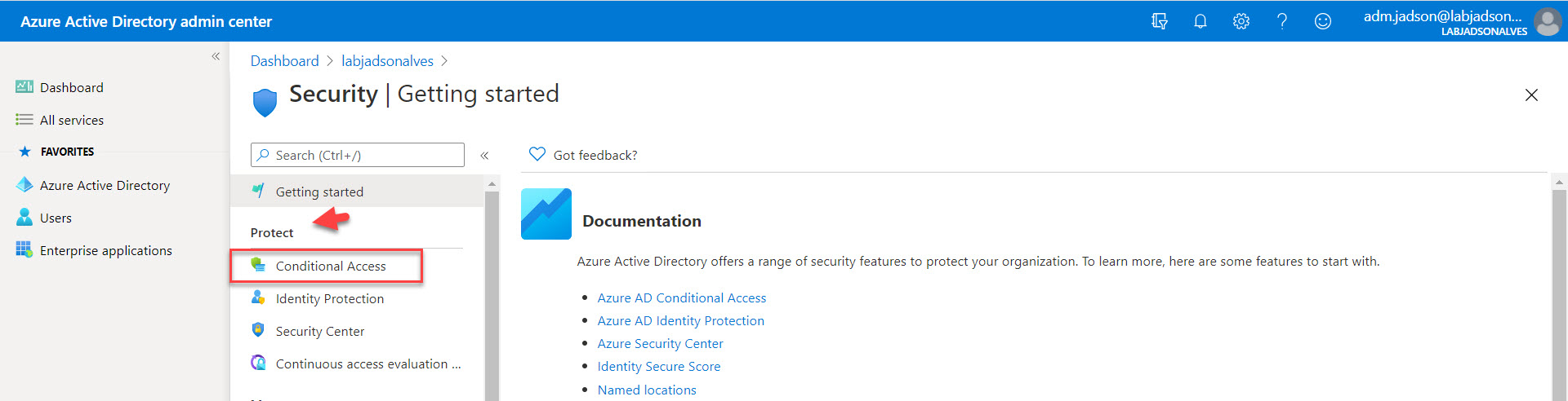 09 – Na tela Security | Getting started, clique em Conditional Access.
