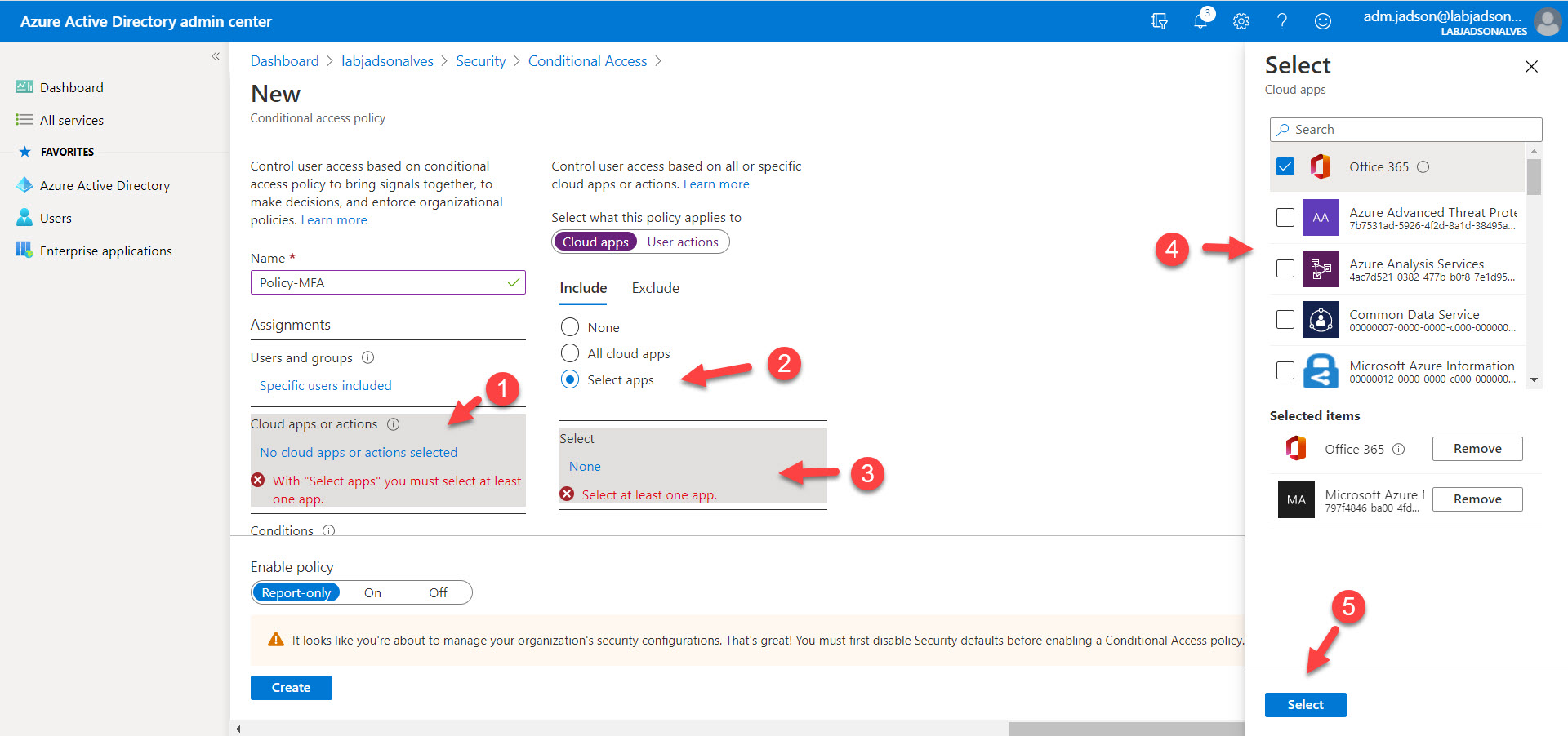 12 – Clique em Cloud apps or actions. Clique em Select apps, selecione o Office 365 e Microsoft Azure Management, em seguida clique em Select.