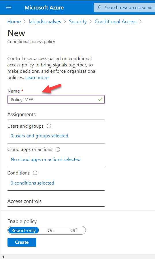 Neste exemplo, vou chamar a política de Policy-MFA e atribuir ao grupo MFA.