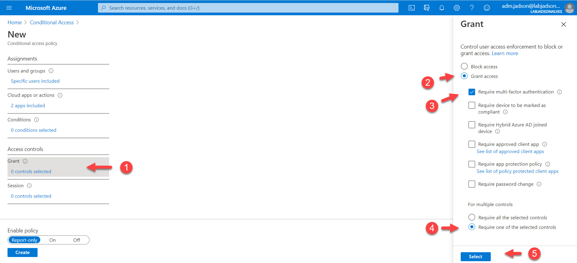 15 – Em Access controls, clique em Grant, selecione Grant access e escolha Require multi-factor authentication. Marque require on of the selected controls e clique em select.