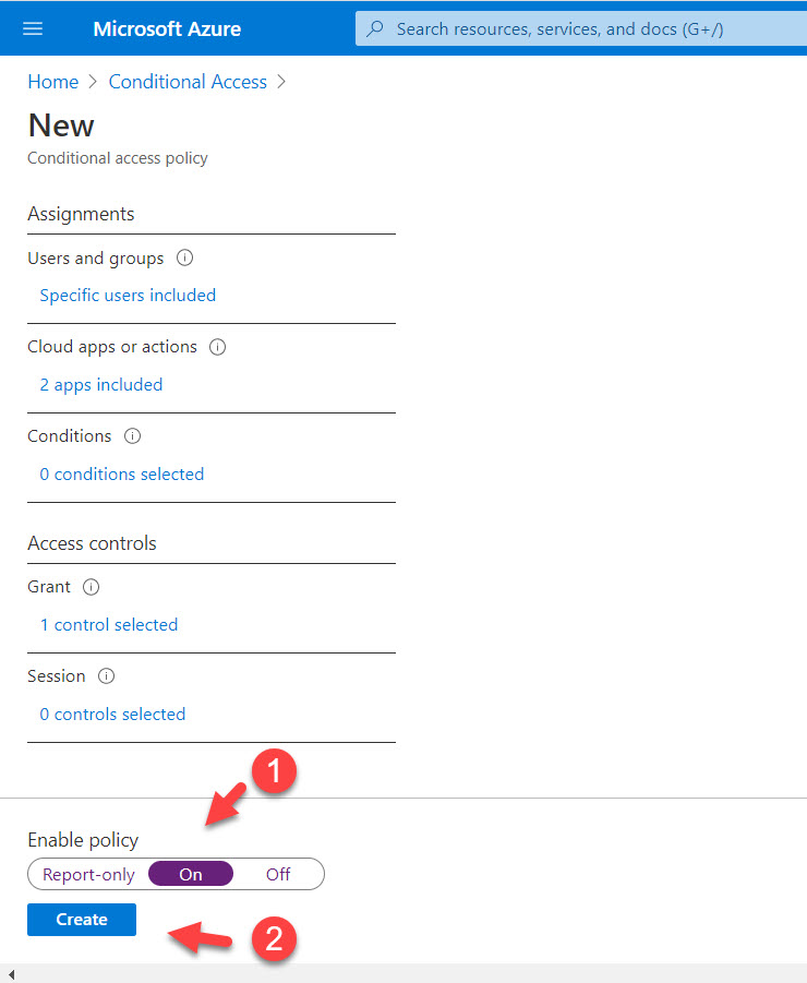 16 – Em Enable policy, marque a opção On e clique em Create.