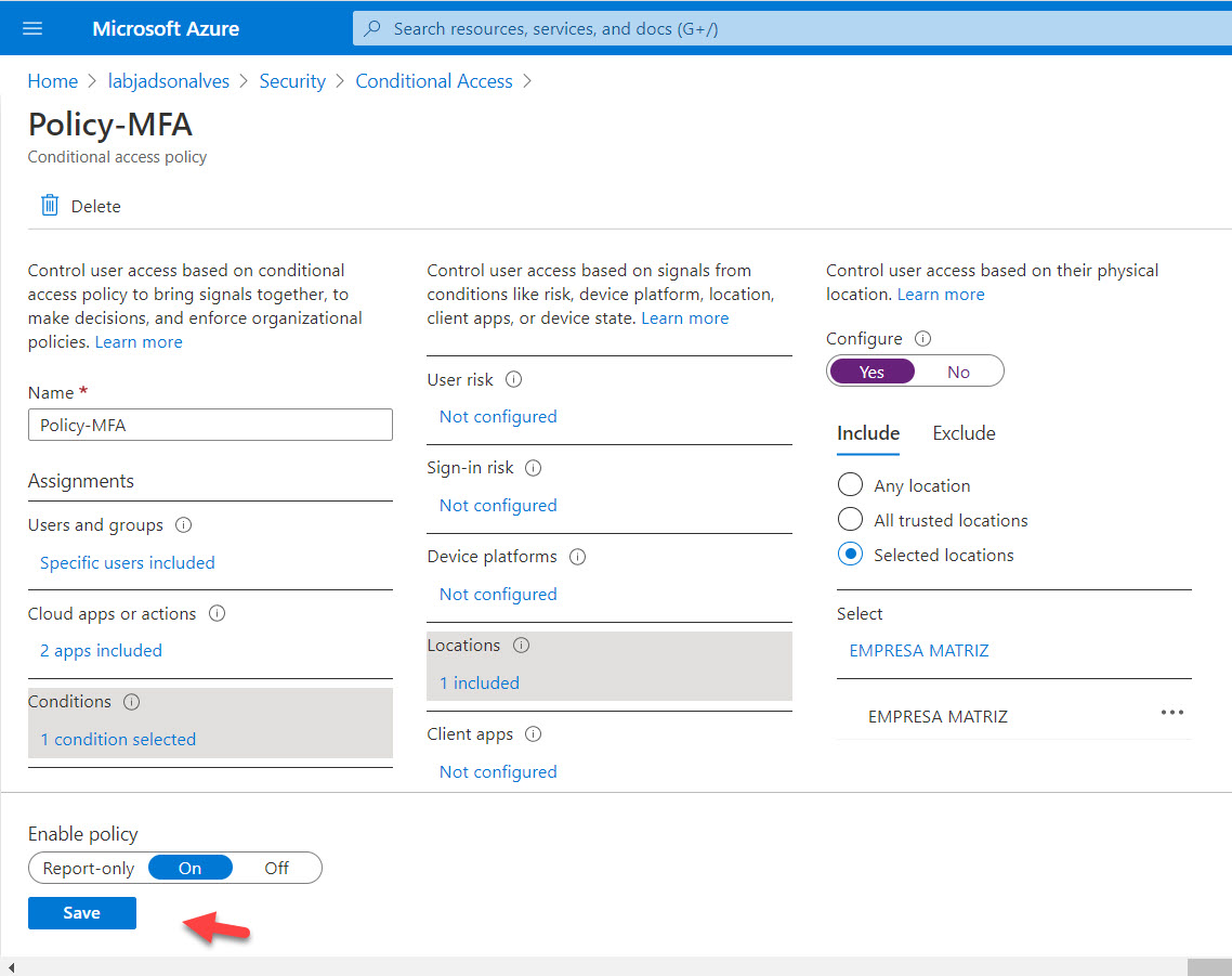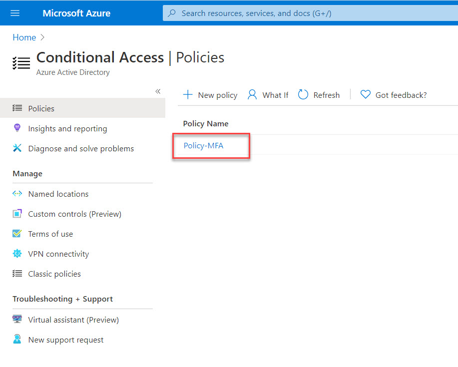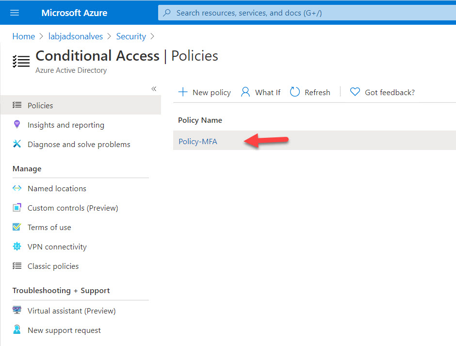 No portal do Azure, pesquise por Azure Active Directory, selecione Security depois Conditional Access. Selecione a política Policy-MFA.