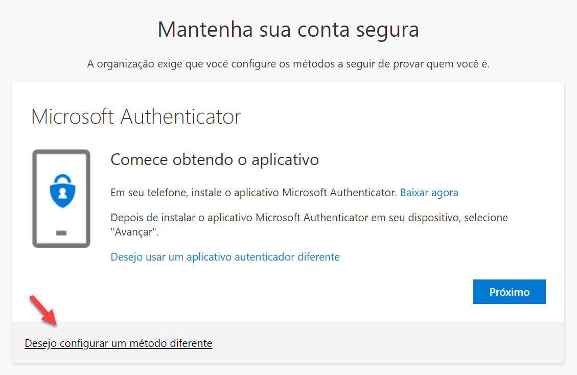 25 – Por padrão, a Microsoft sugere utilizar o Microsoft Authenticator. Neste exemplo, vou selecionar a configuração por telefone. Clique em Desejo configurar um método diferente.