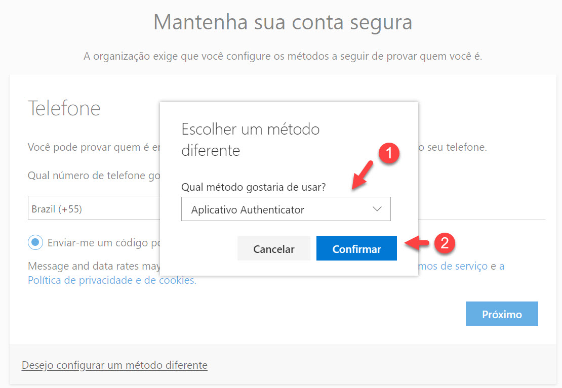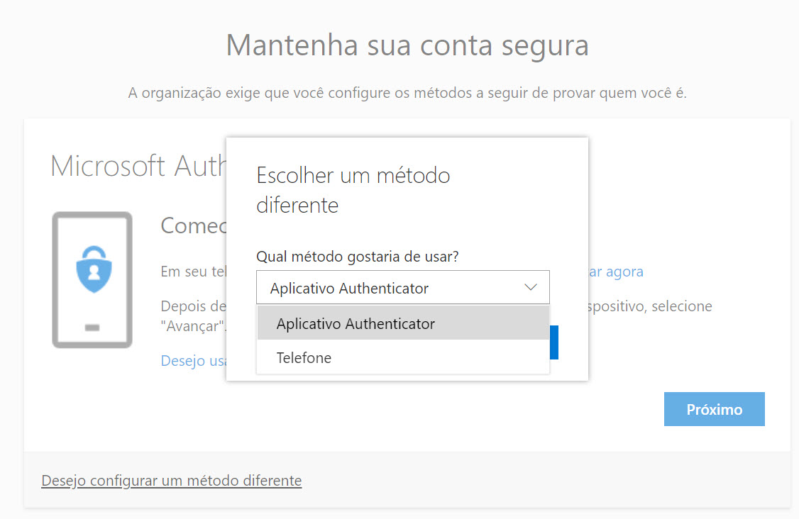 26 – Após selecionar Desejo configurar um método diferente, é possível escolher entre Aplicativo Authenticator ou Telefone.