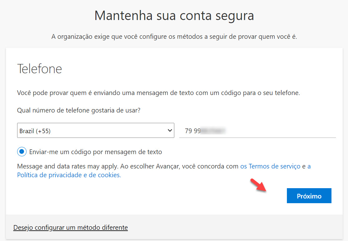 28 – Com a opção Telefone, uma mensagem de texto será enviada com um código de verificação para o telefone inserido. Insira seu número de telefone e clique em Próximo.