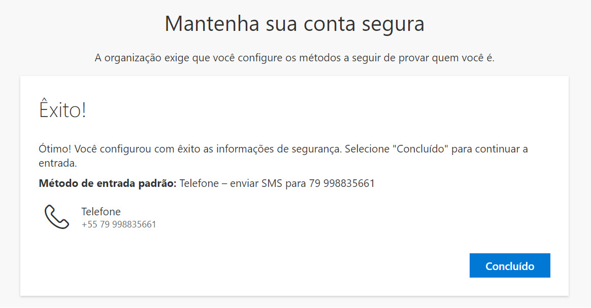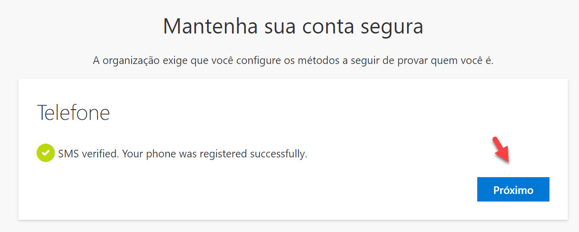 31 – Observe na imagem abaixo que a verificação por SMS foi configurada com sucesso. Clique em Próximo para continuar.