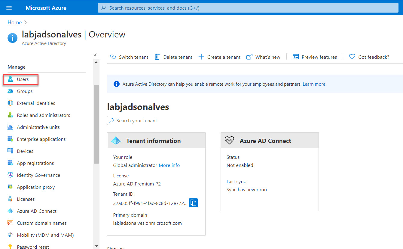 34 – Faça login no Portal do Azure, vá para o Azure Active Directory e clique em Users.