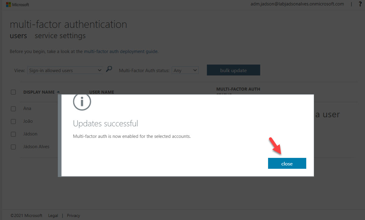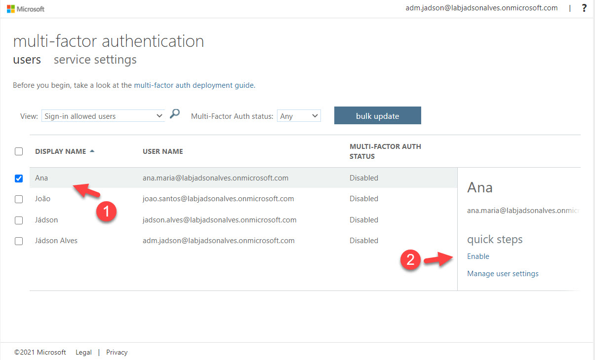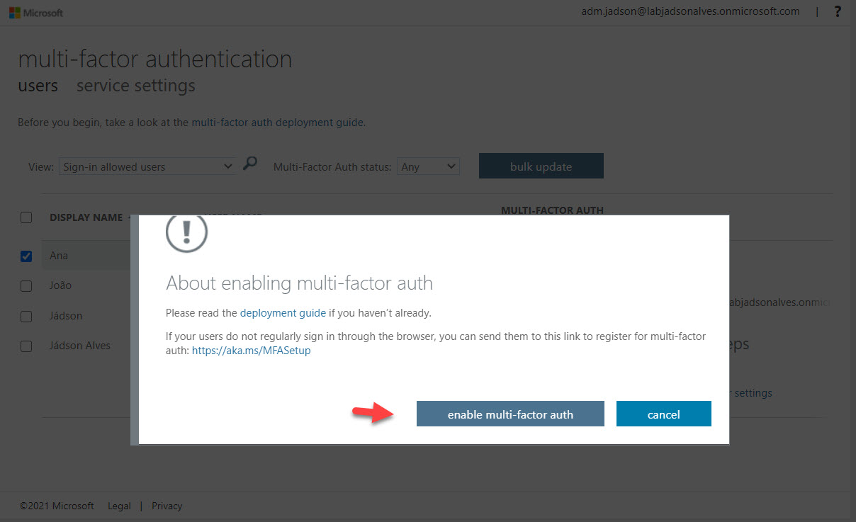 37 – A janela multi-factor authentication será aberta. Selecione o usuário que deseja habilitar o MFA e clique em Enable.