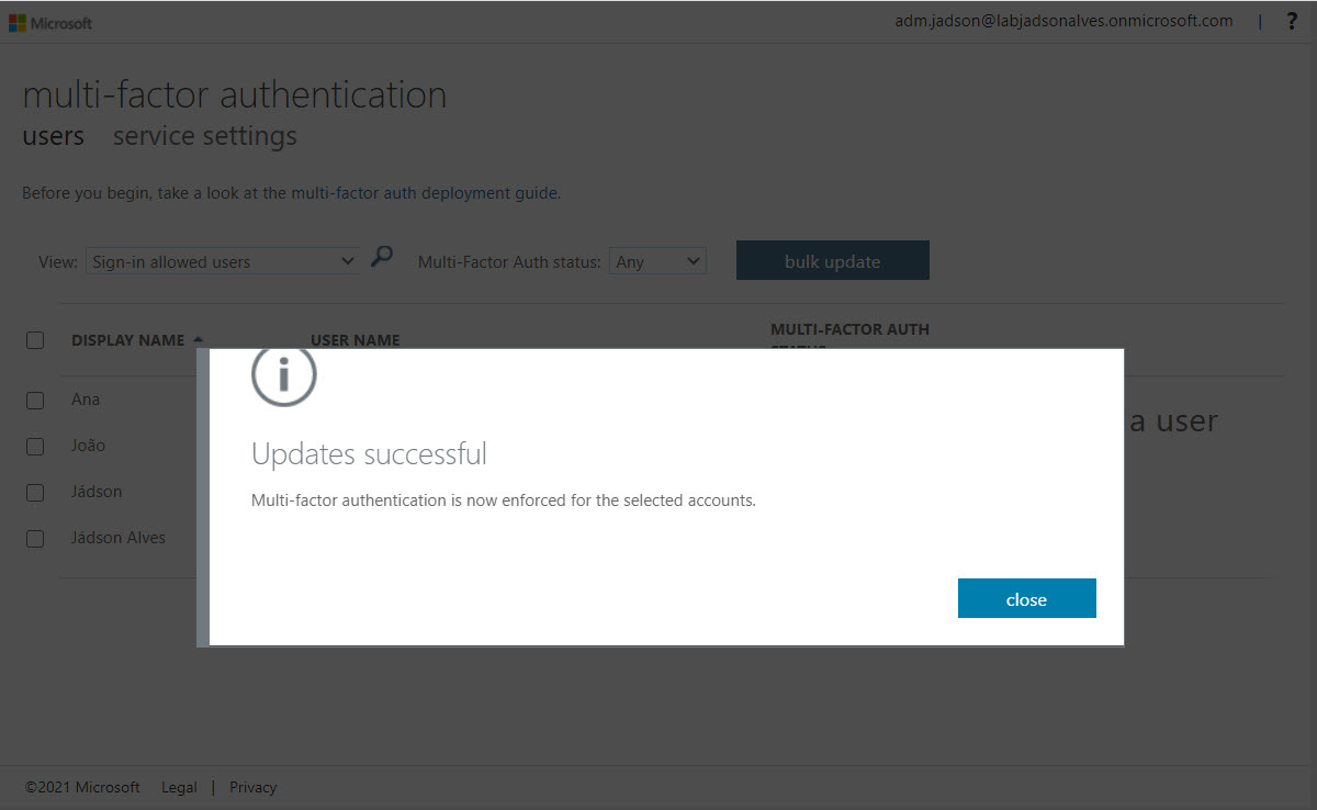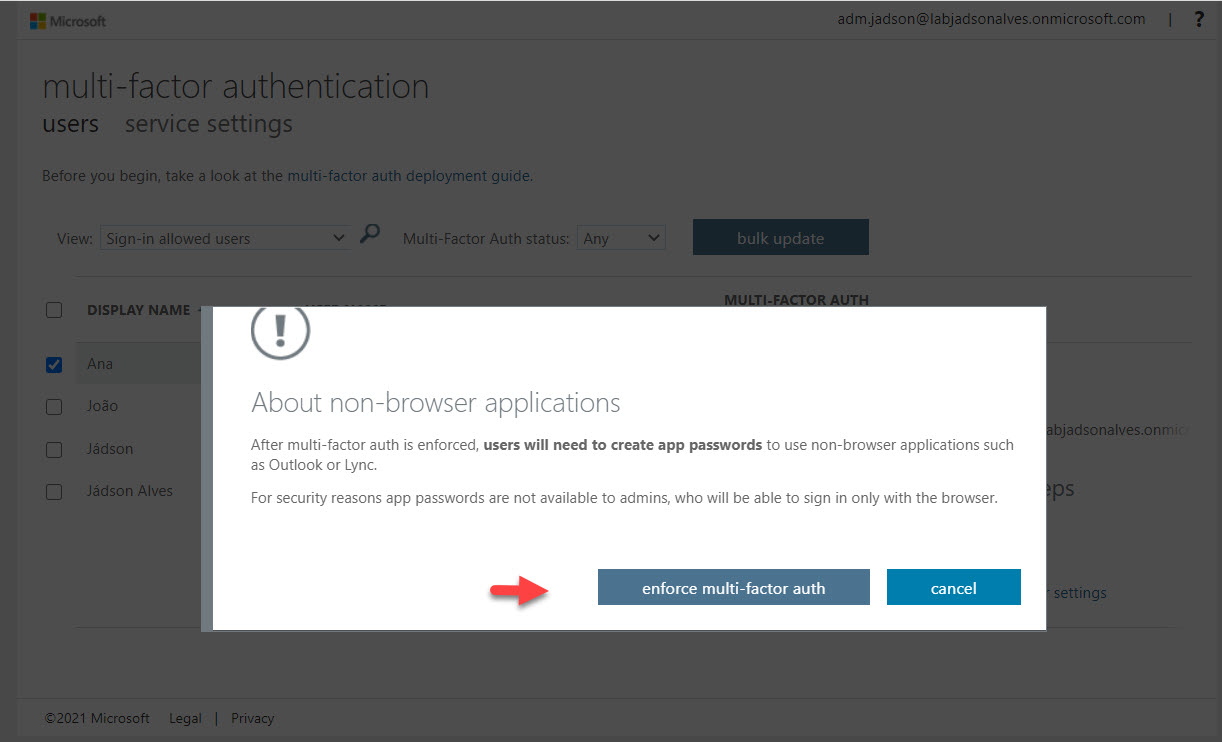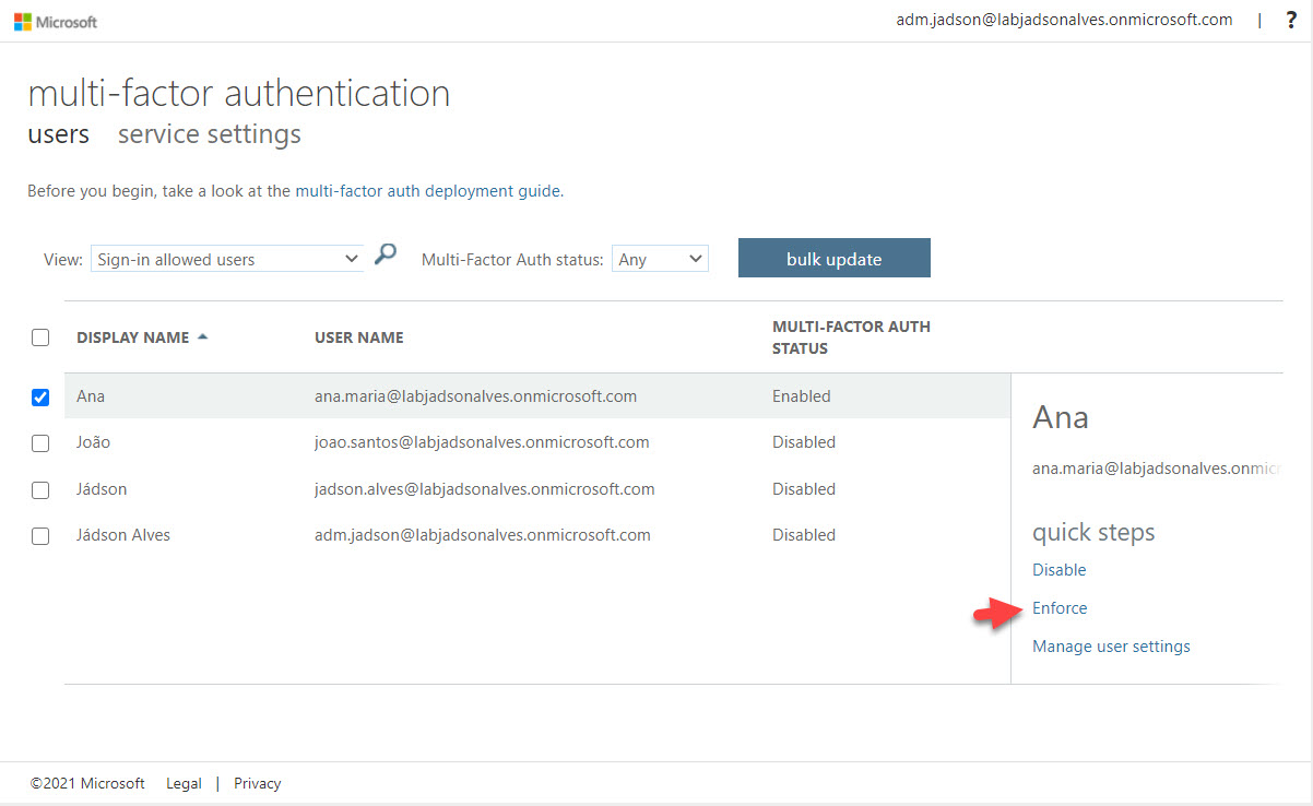 40 – Com o MFA habilitado para o usuário, clique em Enforce para forçar a aplicação do MFA imediatamente.