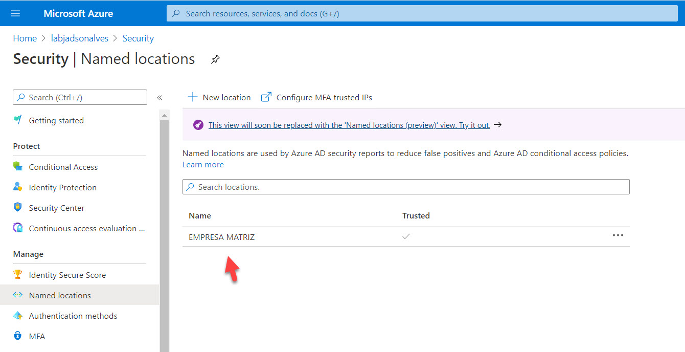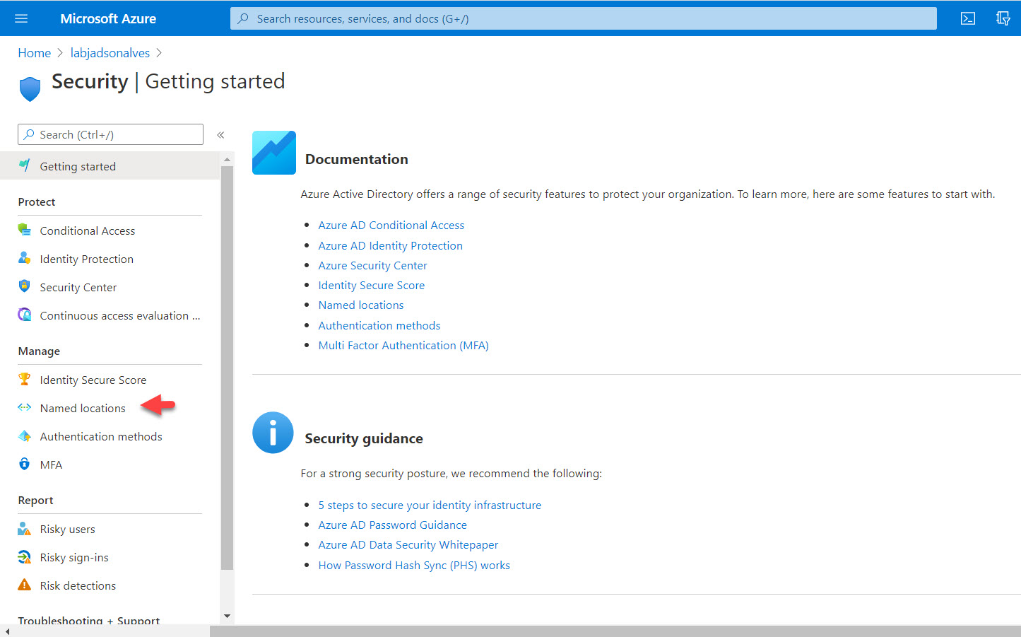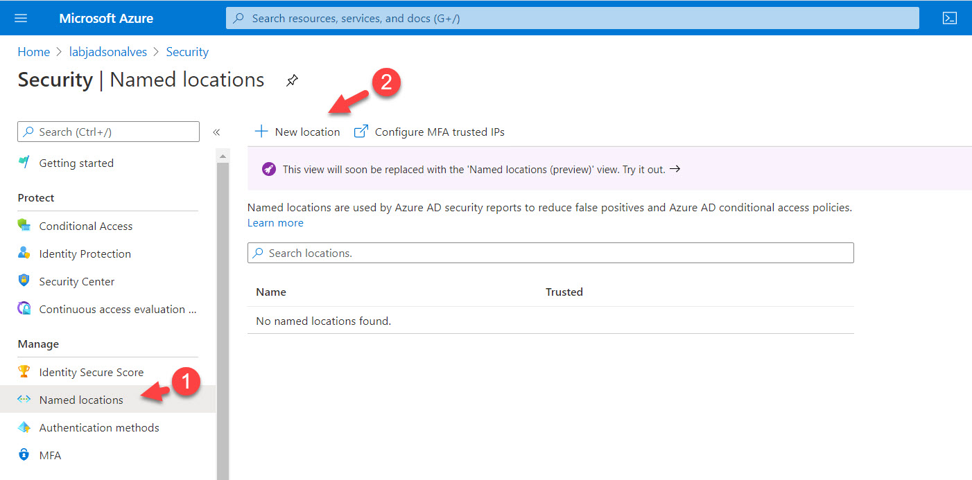 44 – No portal do Azure, pesquise por Azure Active Directory. Em Security, selecione Named Locations.