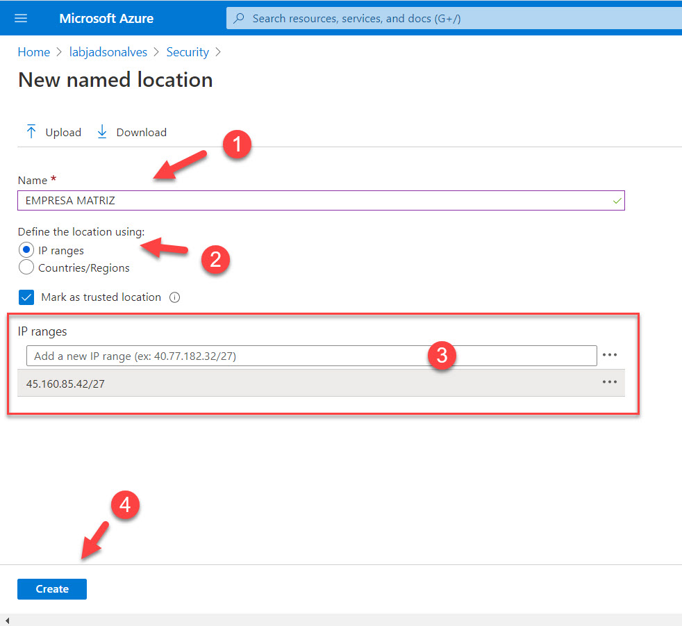 46 – Na tela New named location, selecione um nome e range de endereços IPs Públicos para os quais não deve ser solicitado o MFA. Marque Mark as trusted location e clique em Create.
